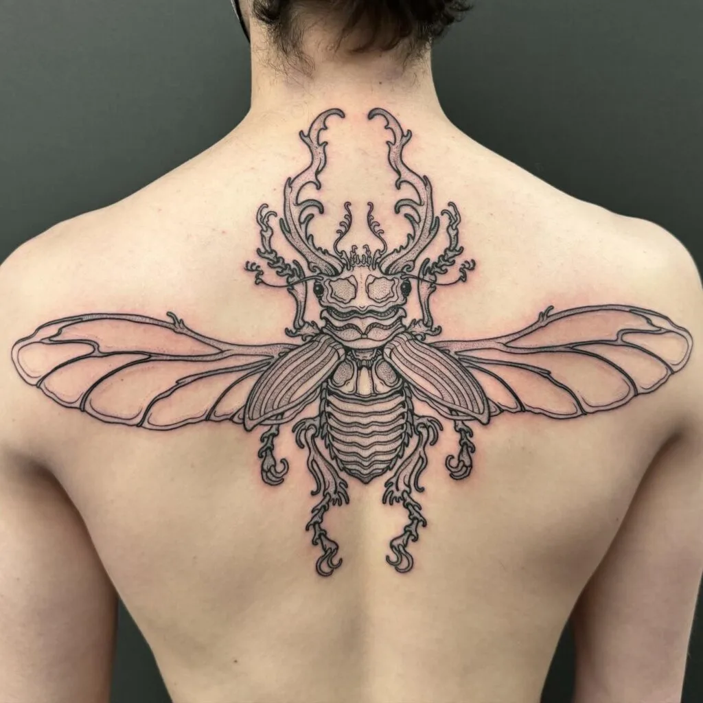 This stunning back tattoo showcases a massive stag beetle with elaborate, flowing lines and open wings, emphasizing its grandeur and elegance. The symmetrical design, paired with intricate detailing in the wings and body, creates a striking visual centerpiece. The swirling extensions on the beetle’s mandibles and legs add an artistic and almost mystical touch.