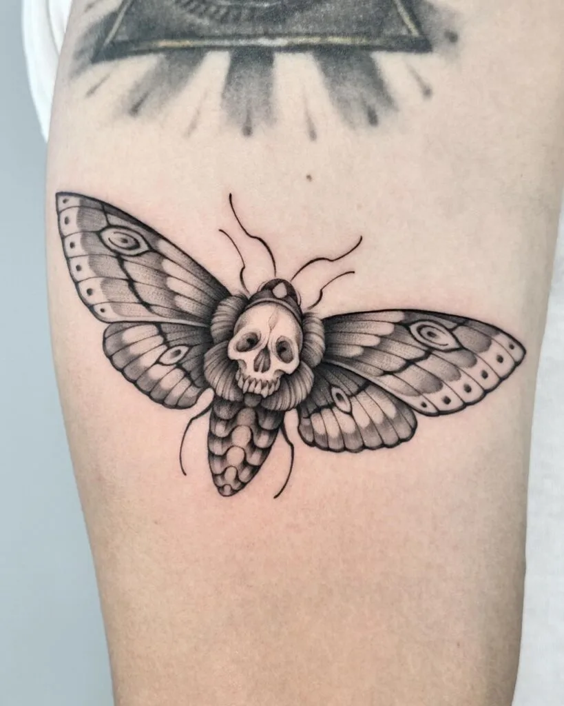 This tattoo features a beautifully rendered death’s-head moth, its iconic skull-shaped marking on the thorax prominently depicted in detailed linework and shading. The wings are intricately patterned, resembling natural textures while maintaining a stylized elegance.