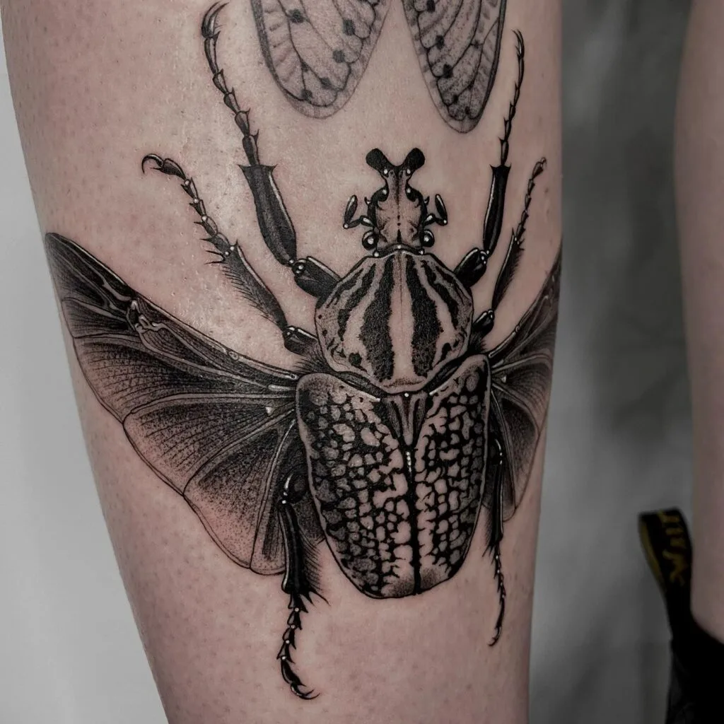 This tattoo showcases a Goliath beetle with remarkable attention to detail, emphasizing its textured shell, segmented legs, and patterned wings. The intricate linework and fine shading bring out the beetle’s natural armor and bold features, making it appear both lifelike and artistic. The open wings add dynamic movement to the design, symbolizing strength and resilience.