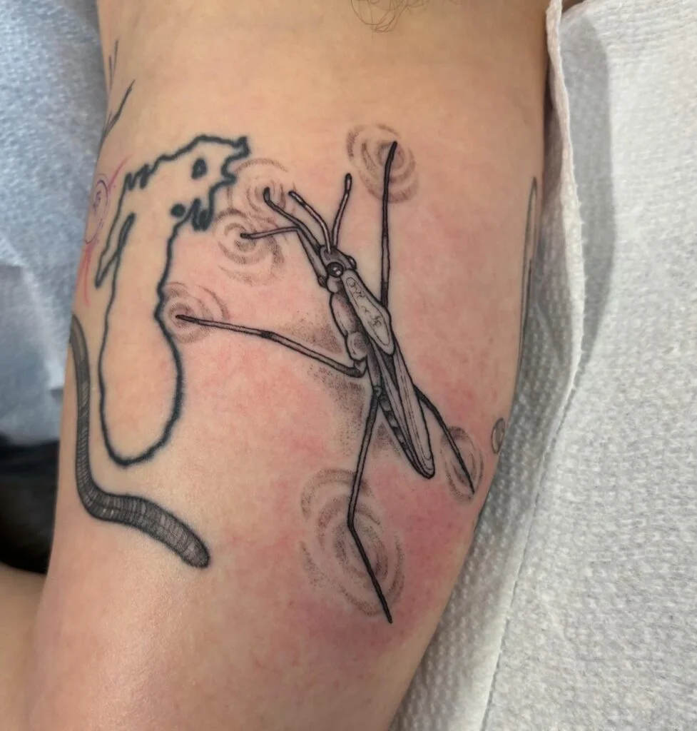 This tattoo features a water strider, delicately designed to capture its movement across the water’s surface. The ripples surrounding the insect’s legs emphasize its light, graceful interaction with the water, adding a sense of motion and realism to the design. The fine linework and subtle shading highlight the insect’s slender body and long legs.
