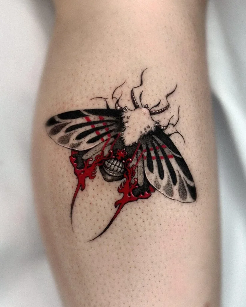 This tattoo features a moth with a hauntingly beautiful design, blending gothic elements with bold red accents. The moth’s intricate wings are detailed with soft black shading and patterned textures, while the vivid red dripping effect adds a dramatic and eerie touch.