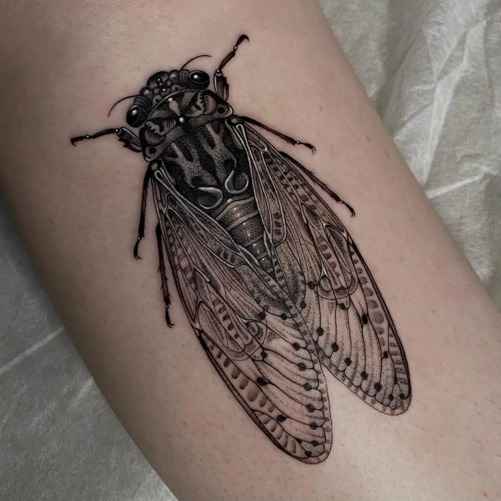 This tattoo features a meticulously detailed cicada, showcasing its iconic elongated body, textured wings, and bold head structure. The fine linework and soft shading give the design a lifelike quality, emphasizing the delicacy of the insect’s transparent wings and the intricate patterns on its body.