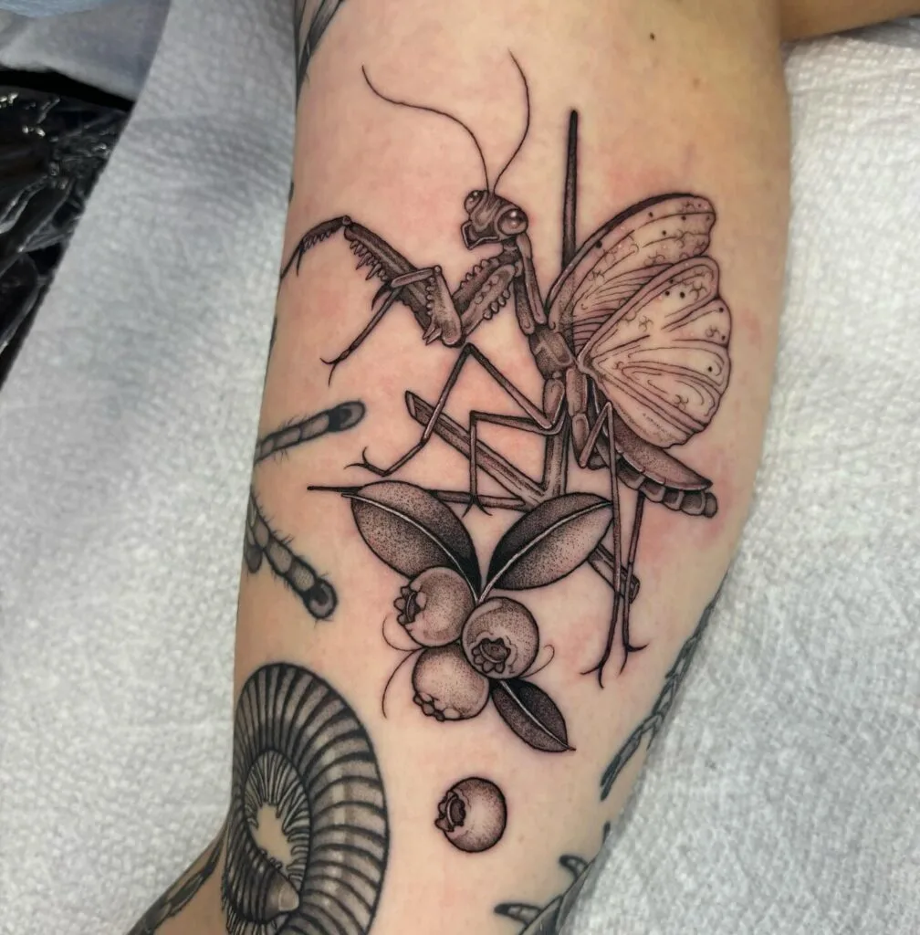 This tattoo beautifully combines the elegance of a praying mantis perched delicately with detailed blueberry plants below. The mantis is intricately designed, highlighting its slender legs, sharp arms, and expressive features, while the soft shading adds depth and texture. The inclusion of the blueberries introduces a naturalistic element, representing abundance, vitality, and connection to nature.