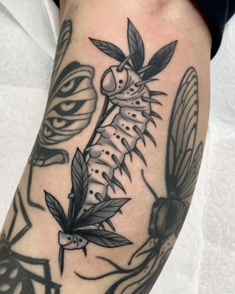 This tattoo showcases a striking caterpillar crawling alongside detailed leaves, blending natural realism with artistic flair. The caterpillar’s segmented body is emphasized through clean linework and shading, highlighting its texture and structure. The surrounding leaves add balance to the design, symbolizing growth and transformation as the caterpillar journeys toward becoming a butterfly or moth.