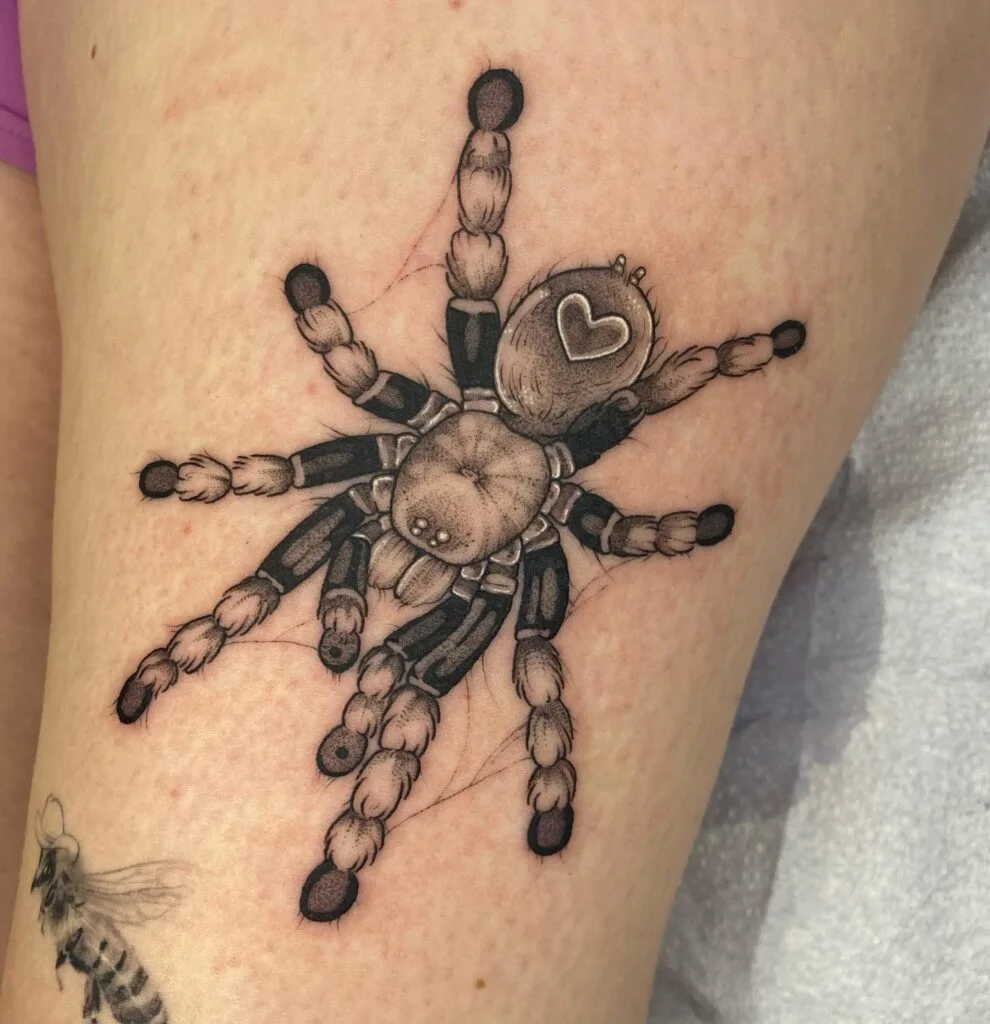 This tattoo features a realistic tarantula, meticulously detailed with textured legs and a soft, fuzzy appearance. The unique heart marking on its back adds a touch of whimsy and warmth to the otherwise bold design, blending the natural world with symbolic charm. The shading and fine linework emphasize the spider’s lifelike structure, making it both intricate and visually striking.