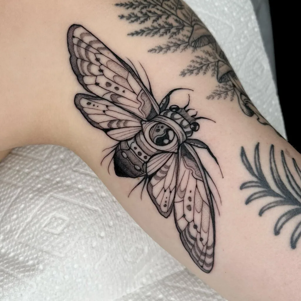 This tattoo portrays a beautifully detailed cicada, showcasing its delicate wings and segmented body with intricate linework and shading. The striking feature is the unique symbolic marking on its thorax, adding a layer of meaning to the design. The realistic rendering of the wings captures their translucent and patterned nature, emphasizing the insect’s natural beauty.
