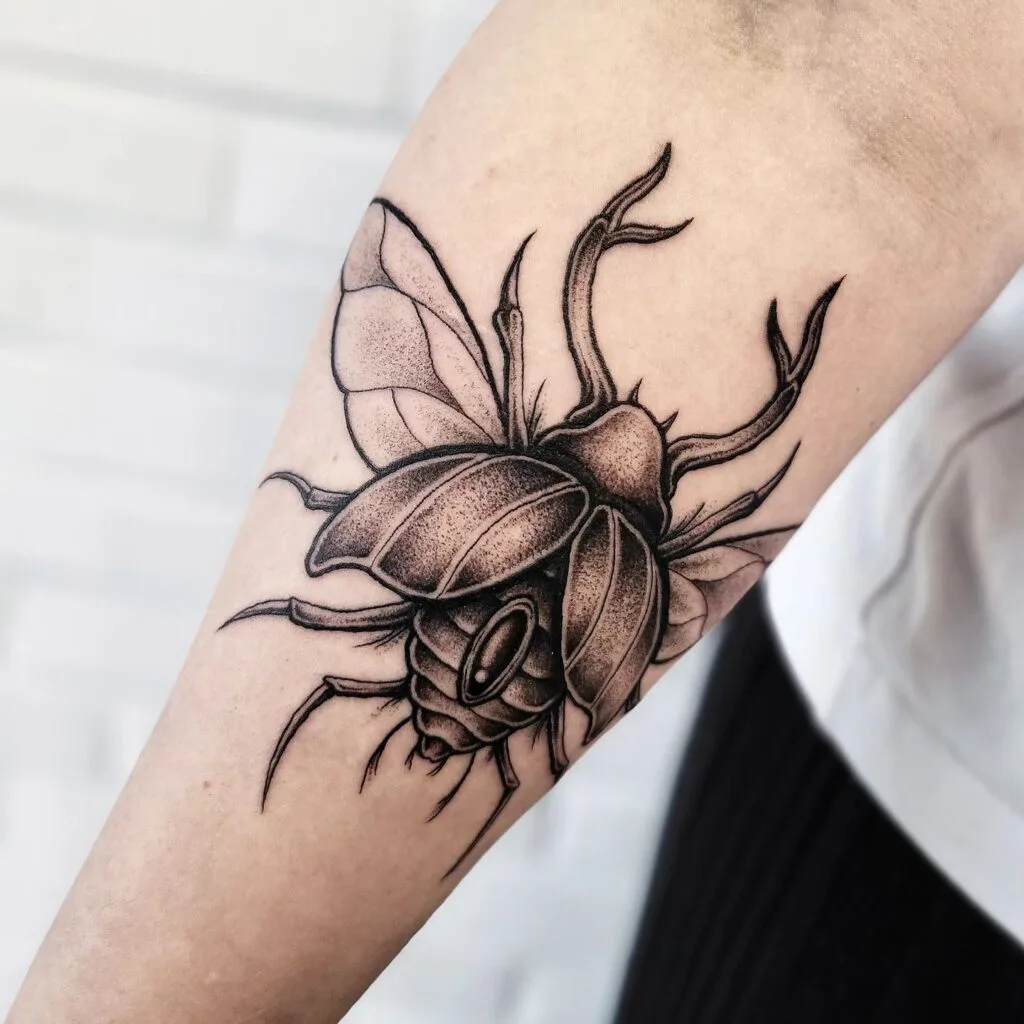 The design symbolizes resilience, strength, and transformation, as beetles often represent personal growth and overcoming challenges. This tattoo is a perfect choice for someone drawn to bold, nature-inspired artwork with a touch of symbolism.