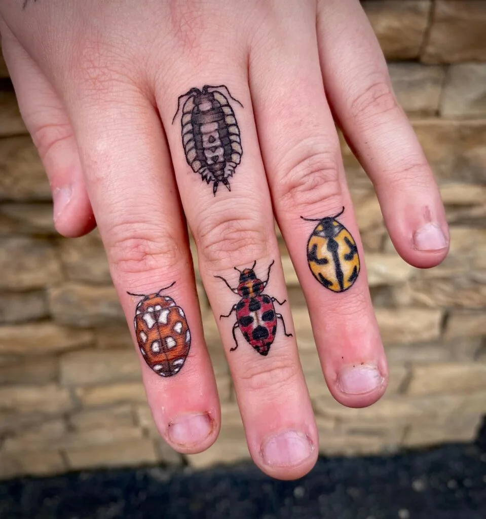 This vibrant set of finger tattoos features a collection of detailed insects, each uniquely designed to stand out. From the earthy tones of a woodlouse to the bright patterns of ladybugs and beetles, these tattoos celebrate the diversity and charm of the insect world.