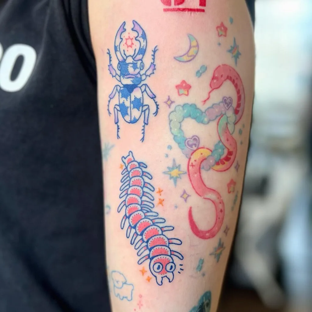 This tattoo features a lively collection of bugs and worms in a vibrant, cartoonish style. A blue beetle with bold patterns, a cheerful pink centipede, and intertwined pastel worms surrounded by stars and moons create a dreamy, whimsical composition.