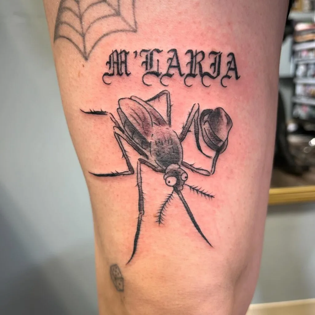 This tattoo features a cartoonish mosquito tipping its hat, embodying a humorous and quirky vibe. Above it, the word “M’LARIA” is written in elegant script, adding a clever pun on malaria and the mosquito’s formal demeanor.
