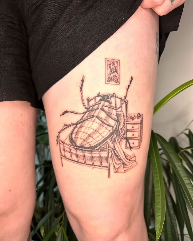 This tattoo depicts a giant bug resting in a bed, referencing Franz Kafka’s novella The Metamorphosis. The intricate design captures the unsettling transformation of the protagonist, Gregor Samsa, who awakens one day as an insect. Details like the bedside table and framed artwork enhance the domestic setting, contrasting the surreal subject matter.