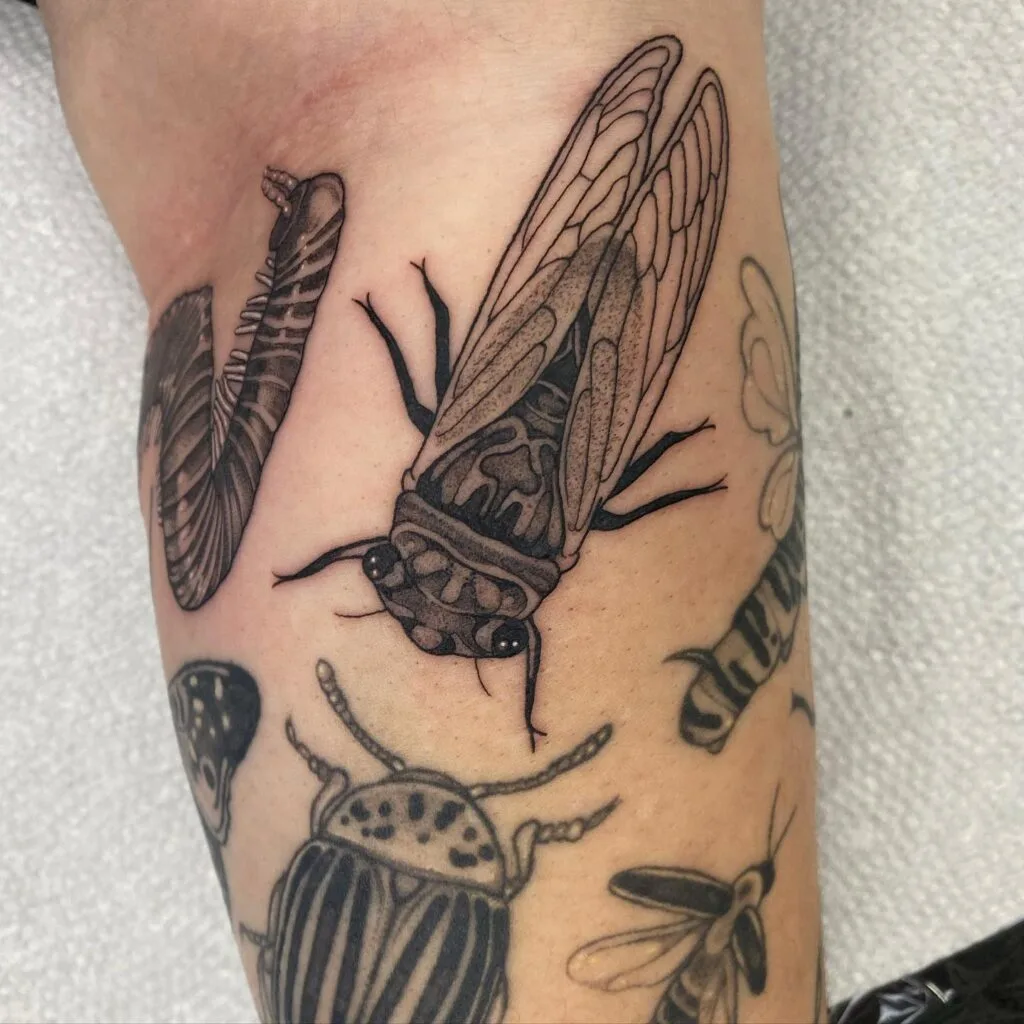 This tattoo features a meticulously designed cicada, showcasing its distinctive patterned wings and segmented body. The realistic linework and shading highlight the insect’s intricate anatomy. Positioned among other insect tattoos, including a worm and beetles, it creates the feel of an entomology display.
