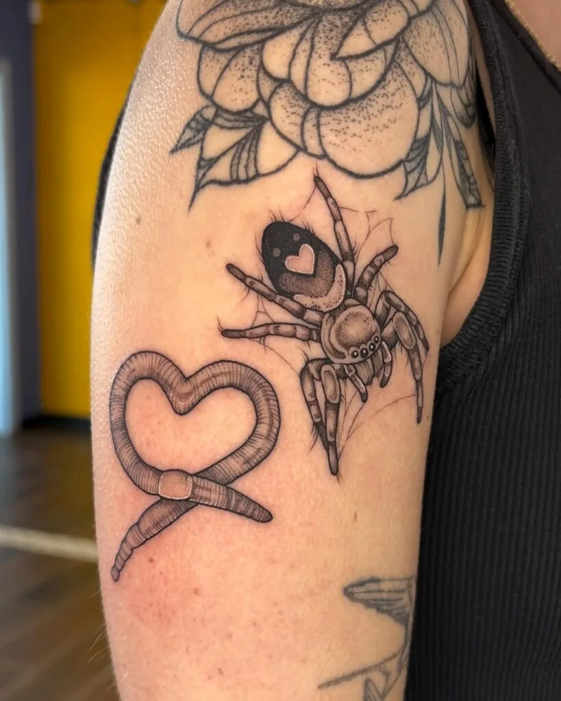 This tattoo combines an endearing spider with a heart-shaped marking on its body and a worm bent into a heart shape. The spider, with its detailed legs and lifelike shading, is given a playful and affectionate touch through its symbolic heart.