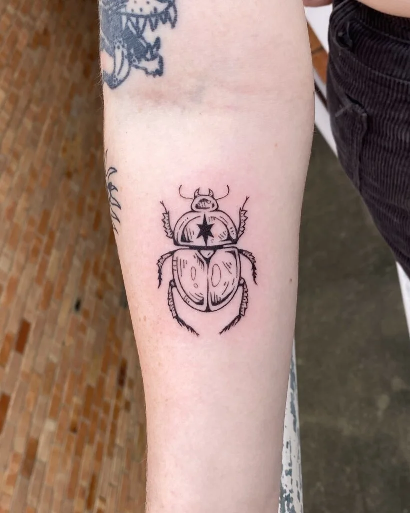 This tattoo features a minimalist beetle design adorned with a bold star on its shell. The clean linework and simple detailing give the beetle a stylized and modern aesthetic. The star adds a unique focal point, hinting at themes of guidance, individuality, or cosmic energy. Its compact and symmetrical design makes it ideal for a small yet meaningful tattoo.