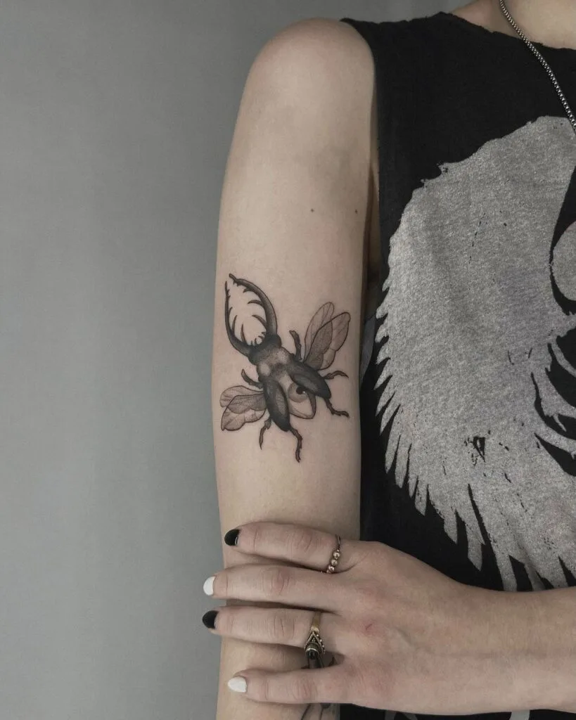 This tattoo presents a majestic stag beetle in flight, with its impressive mandibles and delicate wings fully extended. The soft shading and precise detailing give the beetle a lifelike appearance while maintaining an artistic flair. Its placement on the arm enhances the tattoo’s visibility, making it a striking statement piece.