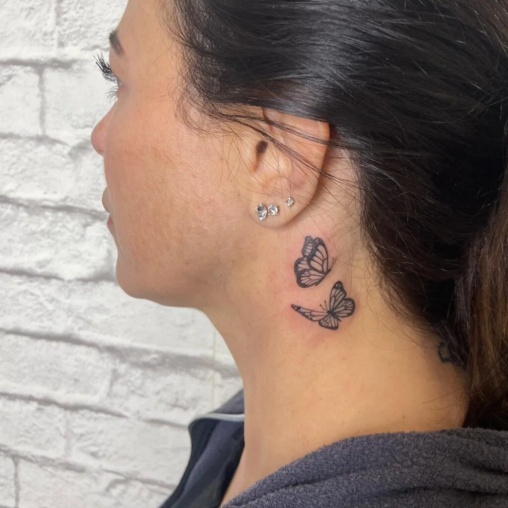 This minimalist tattoo features two finely outlined butterflies gently placed behind the ear. The delicate linework captures the lightness of their wings as if they’re caught mid-flight. The design’s simplicity gives it a quiet charm, while its placement adds a whisper of elegance and mystery.
