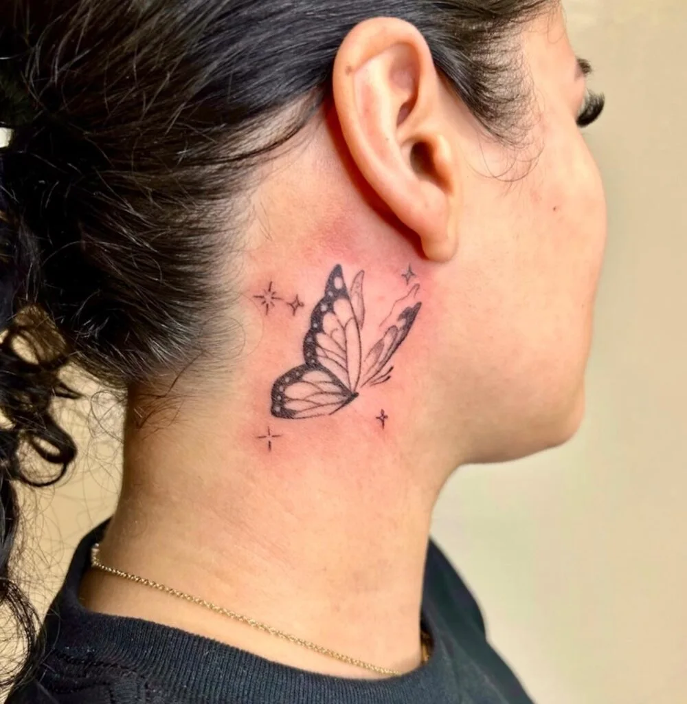Its placement adds a touch of mystery and femininity, making it perfect for those who want a subtle yet expressive piece. The butterfly, a symbol of transformation and freedom, pairs beautifully with the glittering stars, giving the tattoo a sense of wonder and personal growth. Ideal for those who love minimal yet meaningful ink.