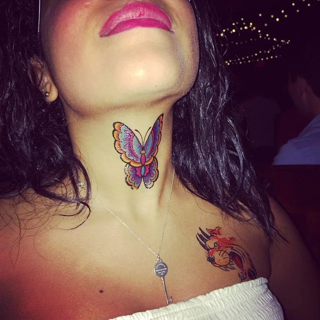 This bold and colorful butterfly tattoo is placed centrally on the throat, making it a striking statement piece. The wings are filled with vivid purples, oranges, pinks, and blues in a symmetrical and ornate style that adds a touch of elegance and artistic flair.