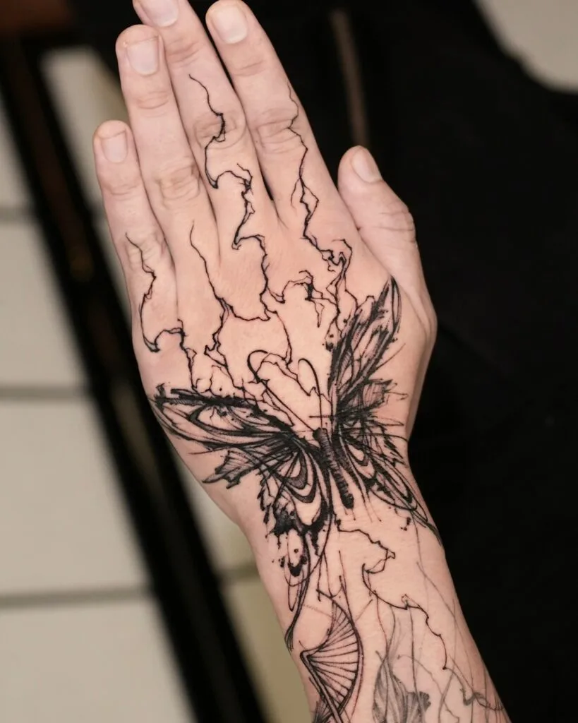 This bold hand tattoo transforms a butterfly into an abstract masterpiece. Sharp, jagged lines ripple outward like lightning, merging with the wings to create a raw, electrifying effect. The butterfly itself is sketched in a chaotic, expressive style that gives the design intense energy and emotion.