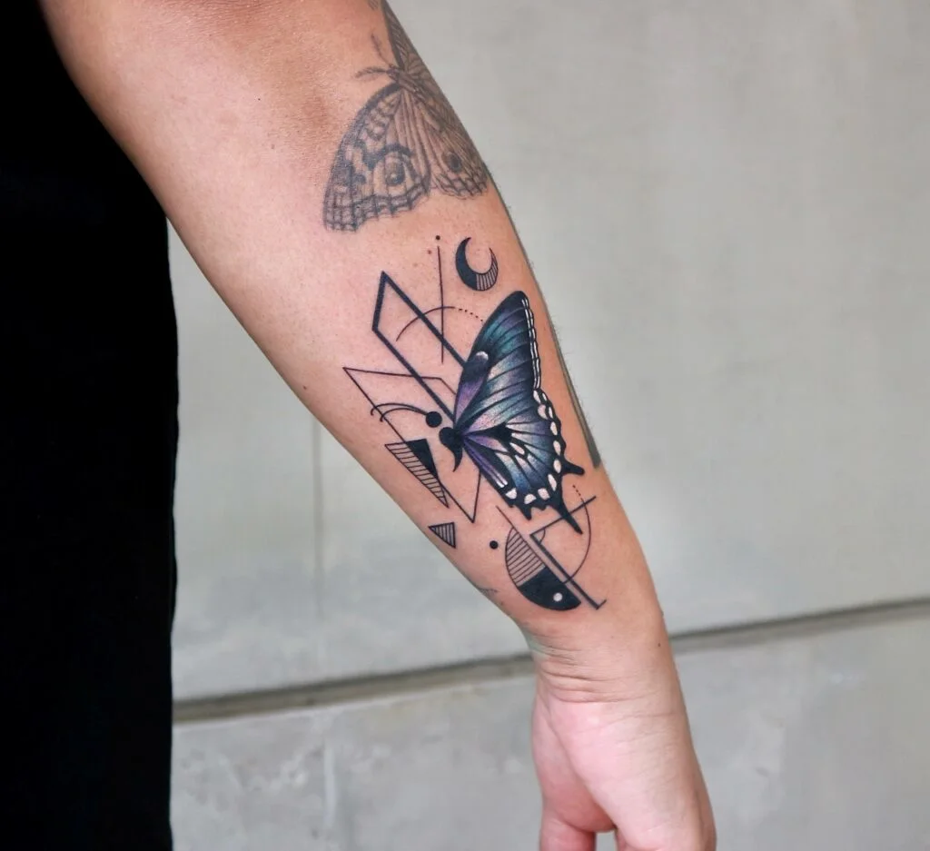 This modern butterfly tattoo blends bold geometry with vivid color. A radiant blue butterfly takes center stage, its wings realistically shaded with hints of purple and teal. Surrounding it are sharp black geometric shapes, lines, dots, and a crescent moon, creating a striking contrast that draws the eye.