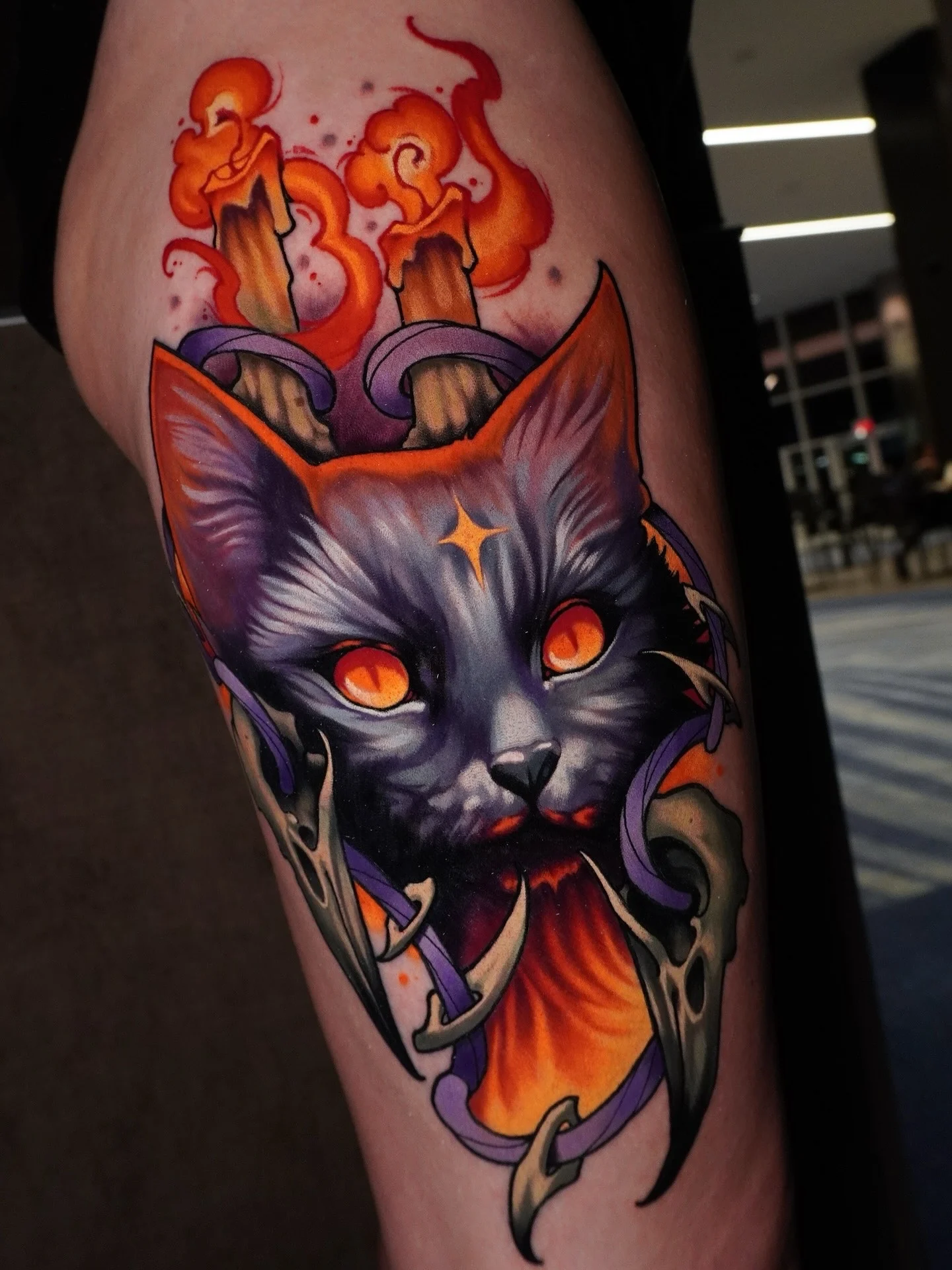 This cat tattoo shows a dark, fantasy style cat with glowing orange eyes and tall candles rising from its head. Bold color fills the design, mixing deep purples, charcoal tones, and fiery orange highlights. Melted wax drips naturally down the candles, adding movement and heat to the composition.