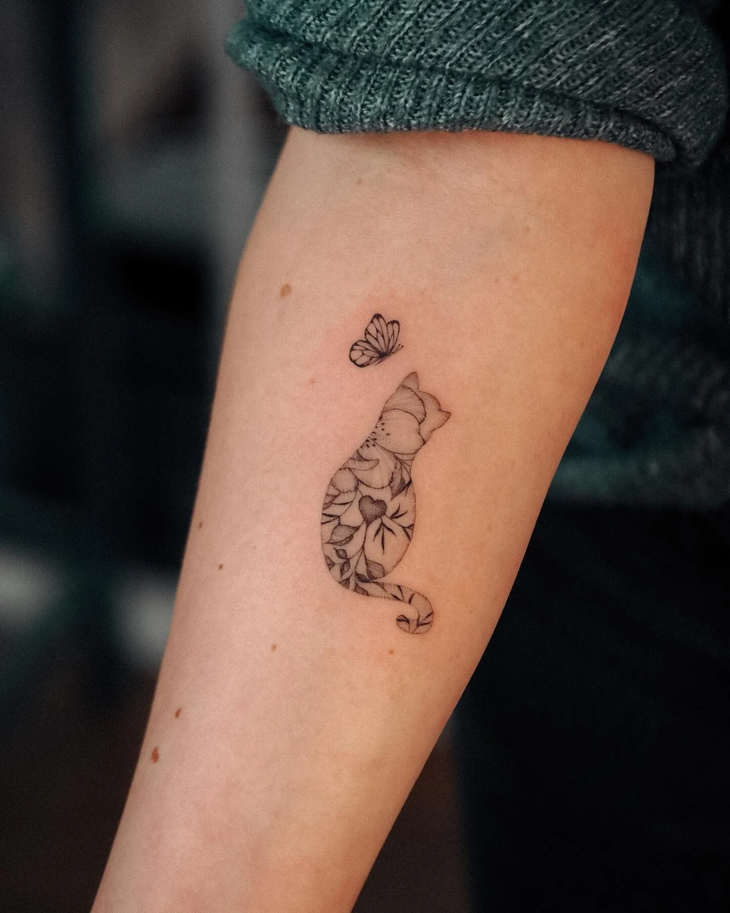 This cat tattoo shows a small sitting cat silhouette filled with fine floral linework. Soft petals and leaves shape the body, creating detail without heavy shading. A tiny butterfly floats above the cat’s face, adding light movement and balance.