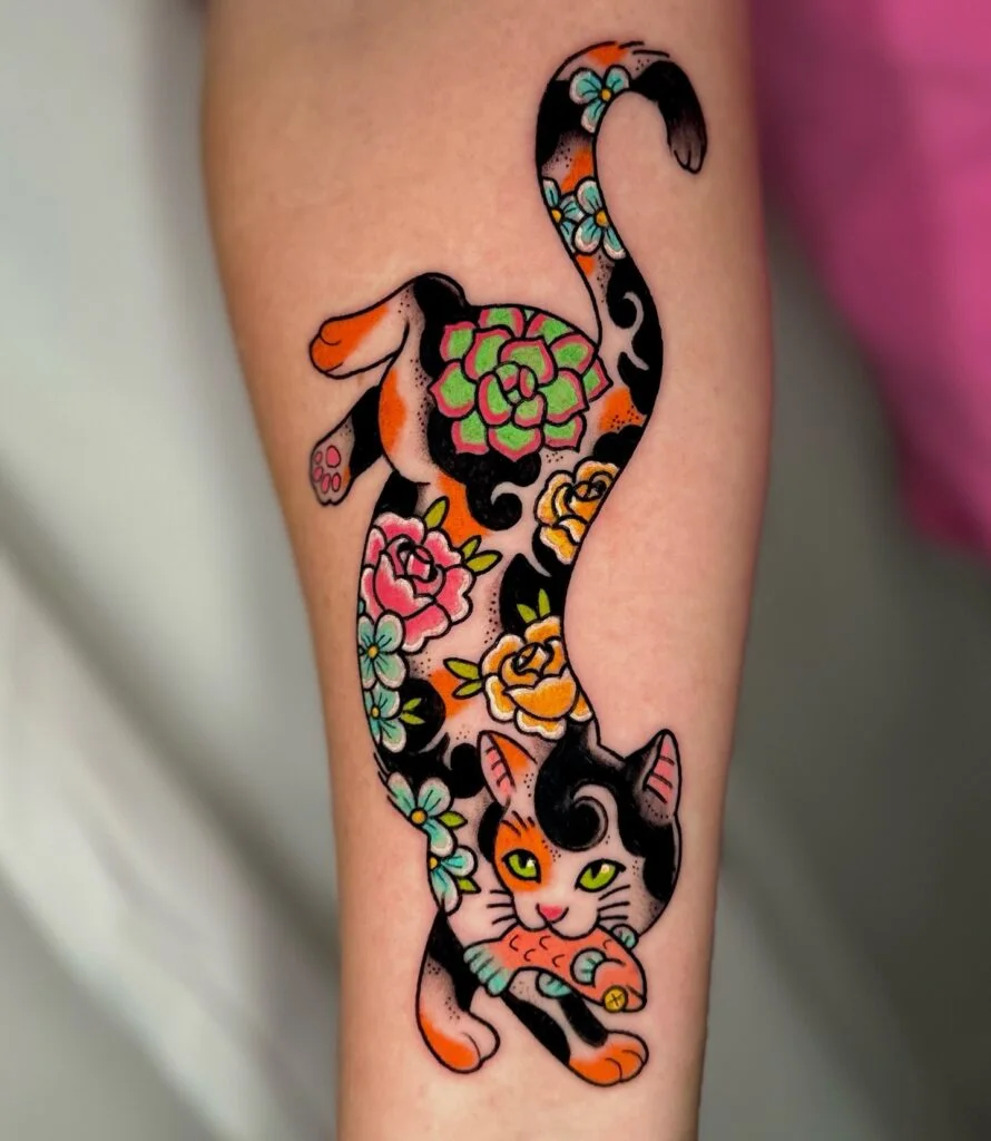 Floral Calico Cat Tattoo With Fish