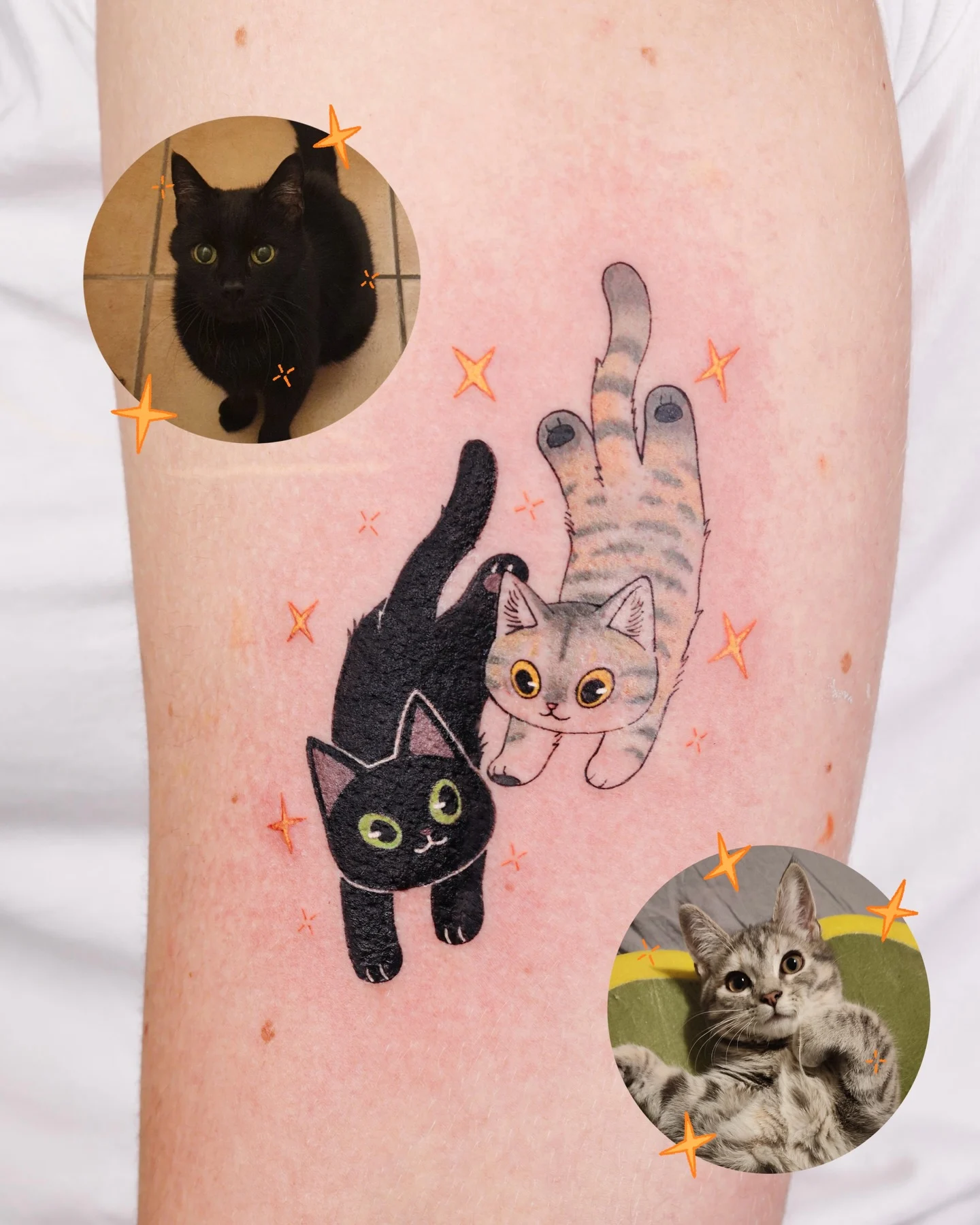 Simple outlines and flat color keep the design light, clean, and readable. Small star accents float around the cats, adding movement without crowding the space. The composition feels balanced, with both cats angled inward to create connection. This tattoo works well as a tribute to bonded pets or shared memories.
