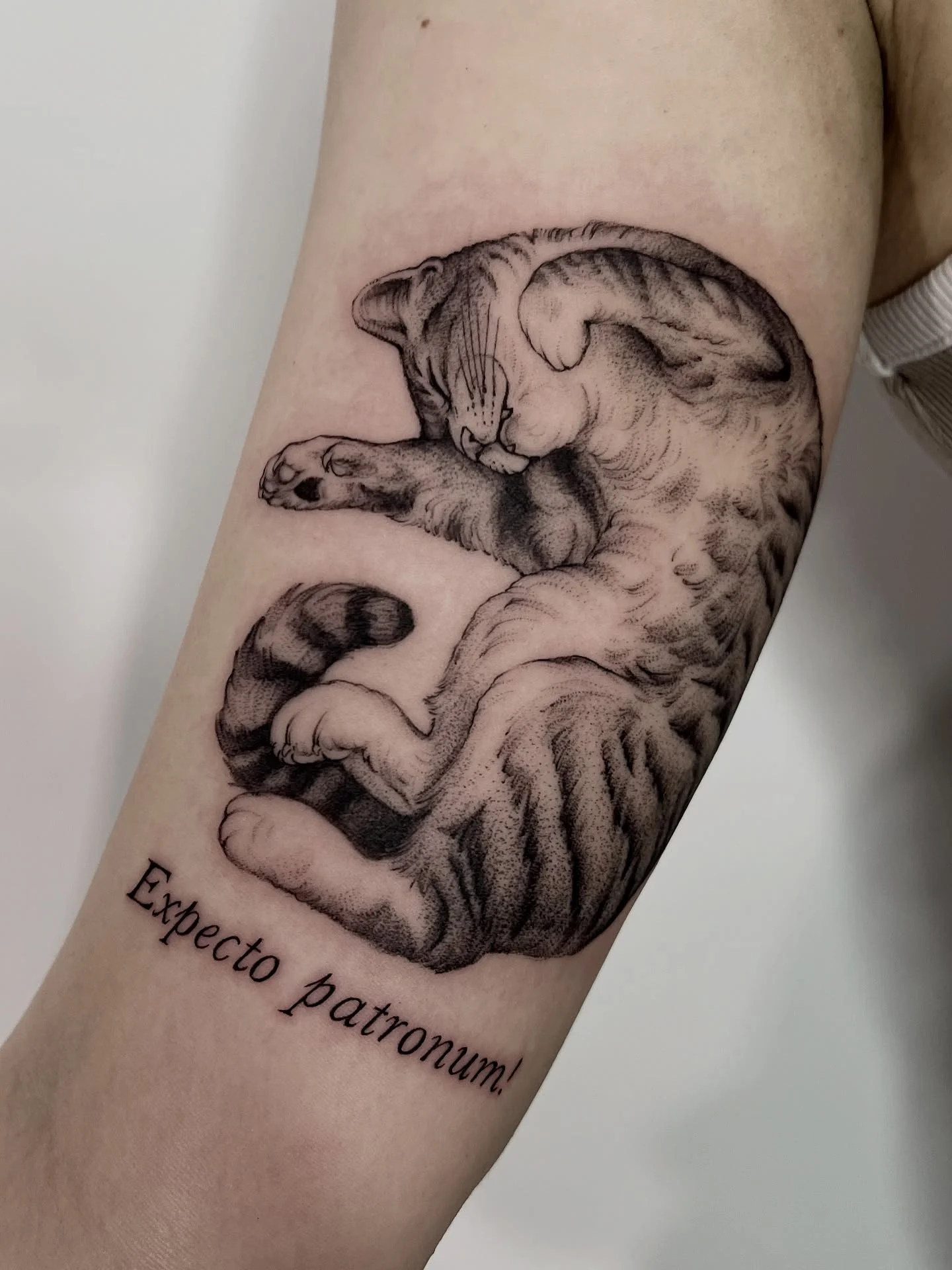 Closed eyes and tucked paws give the cat a calm, peaceful presence. Below the figure, the phrase Expecto patronum adds a personal touch without overpowering the image. This tattoo feels intimate, quiet, and carefully balanced.