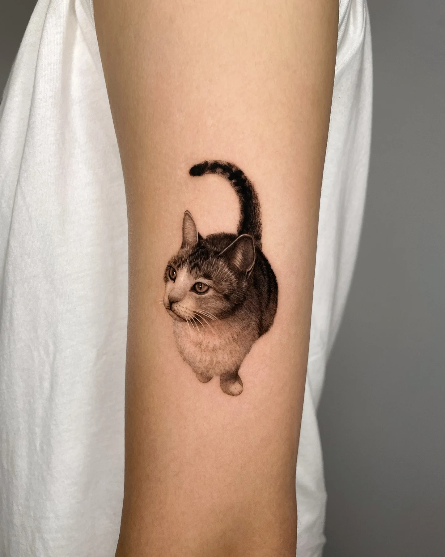 This cat tattoo shows a realistic cat standing upright with its tail curved gently overhead. Soft shading creates natural fur texture, especially around the chest, face, and tail. The eyes look alert and curious, giving the cat a lifelike presence without exaggeration.