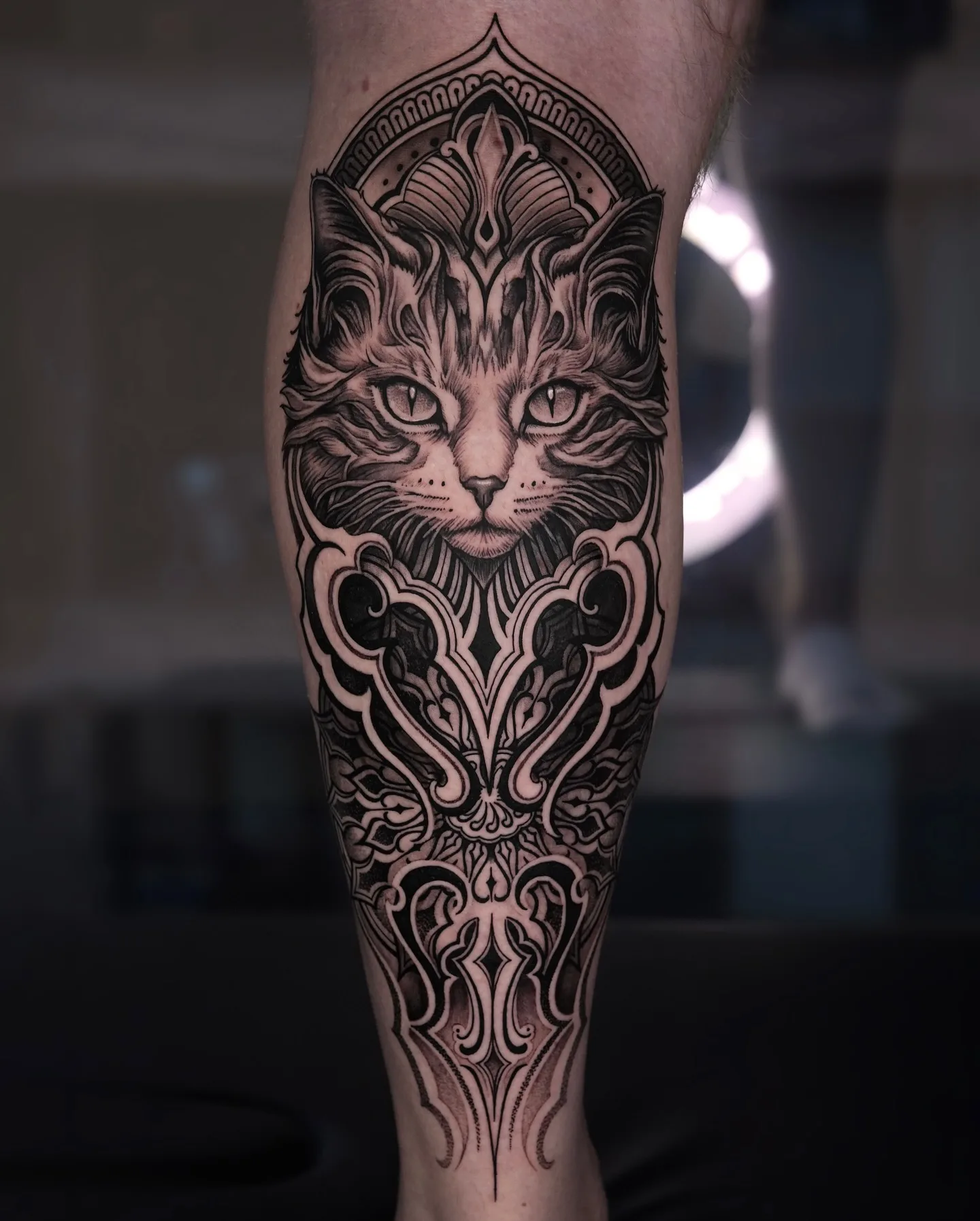 This cat tattoo features a centered cat face framed by an intricate mandala style design. Clean symmetry guides the eye from the pointed arch at the top down through layered ornamental patterns. Fine linework and smooth shading define the cat’s calm expression without overpowering the details.