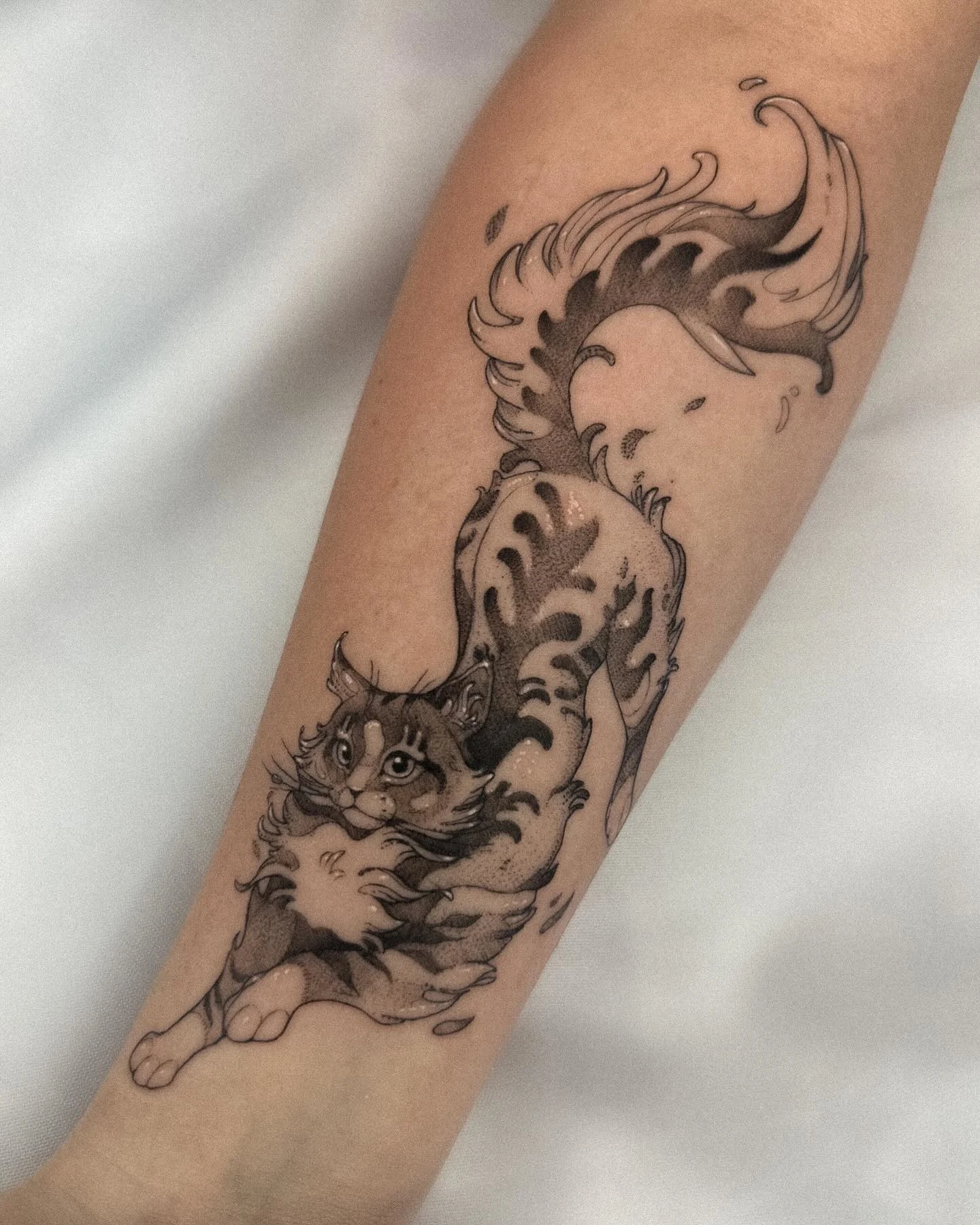 Dynamic Stretching Cat Tattoo With Flowing Fur