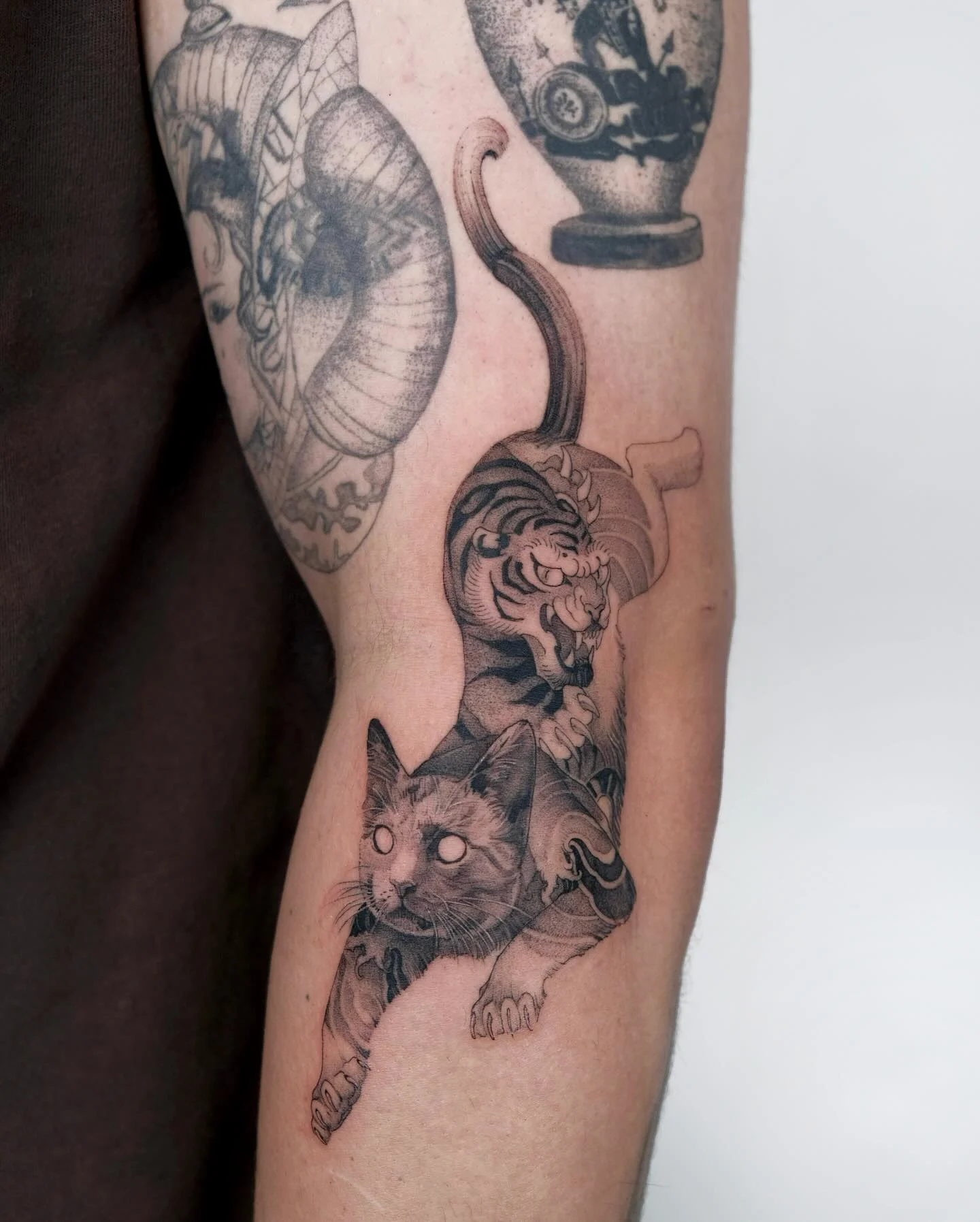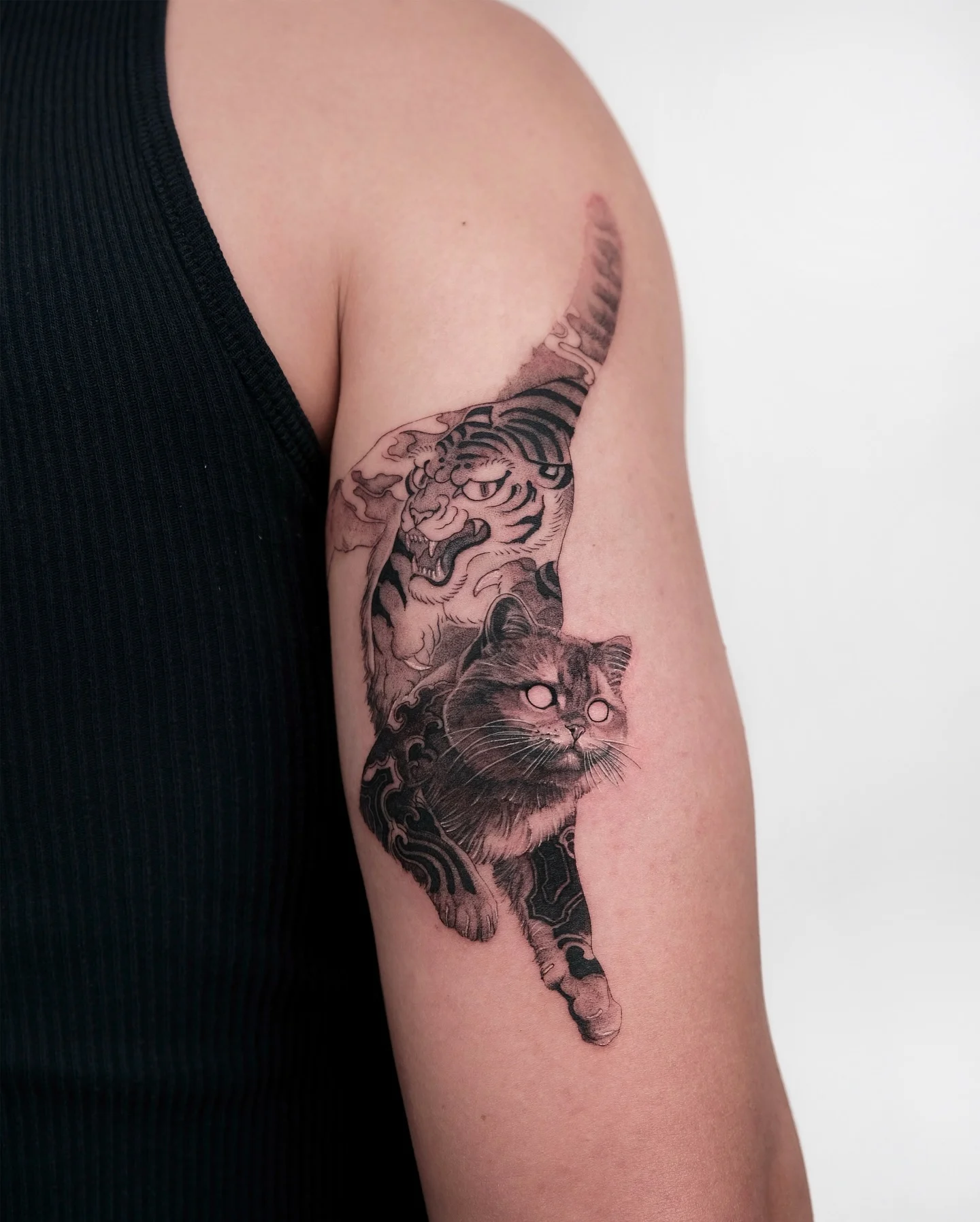 This cat tattoo layers a domestic cat with a tiger spirit rising behind it. Fine black and gray shading defines fur, stripes, and muscle without overwhelming contrast. The cat’s glowing eyes create a dreamlike focal point, while the tiger’s open mouth adds tension and strength.
