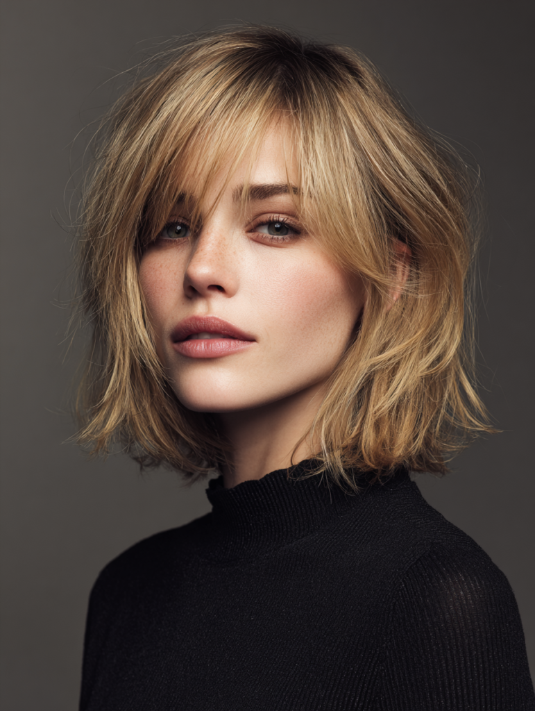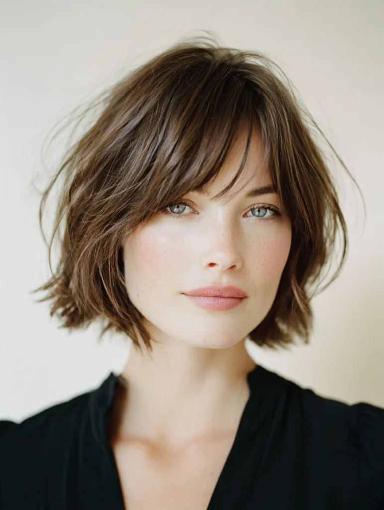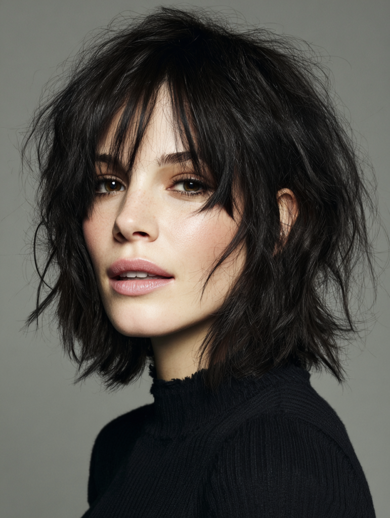 A shag-inspired choppy bob combines bob structure with shag-like energy, delivering a relaxed shape that moves freely. Layers vary in length, creating gentle separation from crown to ends. The cut often includes subtle face-framing pieces that soften the front without crowding it.
