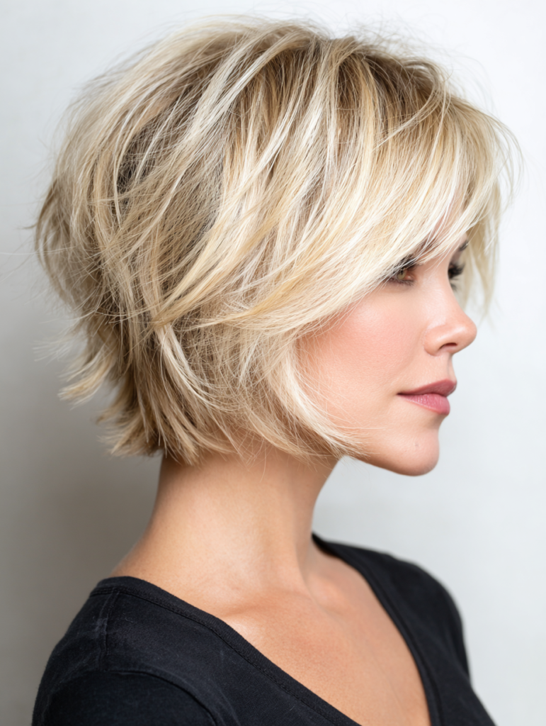 A stacked choppy bob gains height and definition from layered stacking that supports the crown and lifts the outline. Shorter layers near the back shape the silhouette, while longer pieces keep the sides soft. Textured ends prevent the cut from feeling rigid.