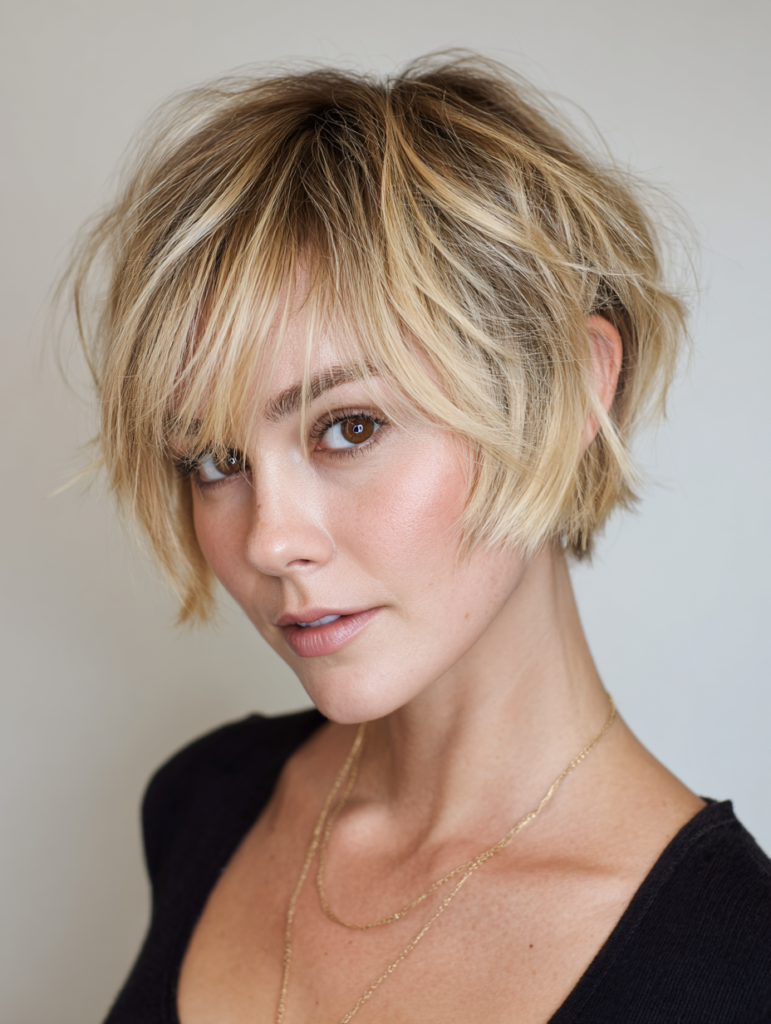 A short choppy bob with a lifted crown creates height that refreshes the overall shape. Layers concentrated at the top encourage the hair to rise, which keeps the cut from appearing flat. Point-cut ends add scattered definition along the perimeter, helping the style fall into place with minimal effort.