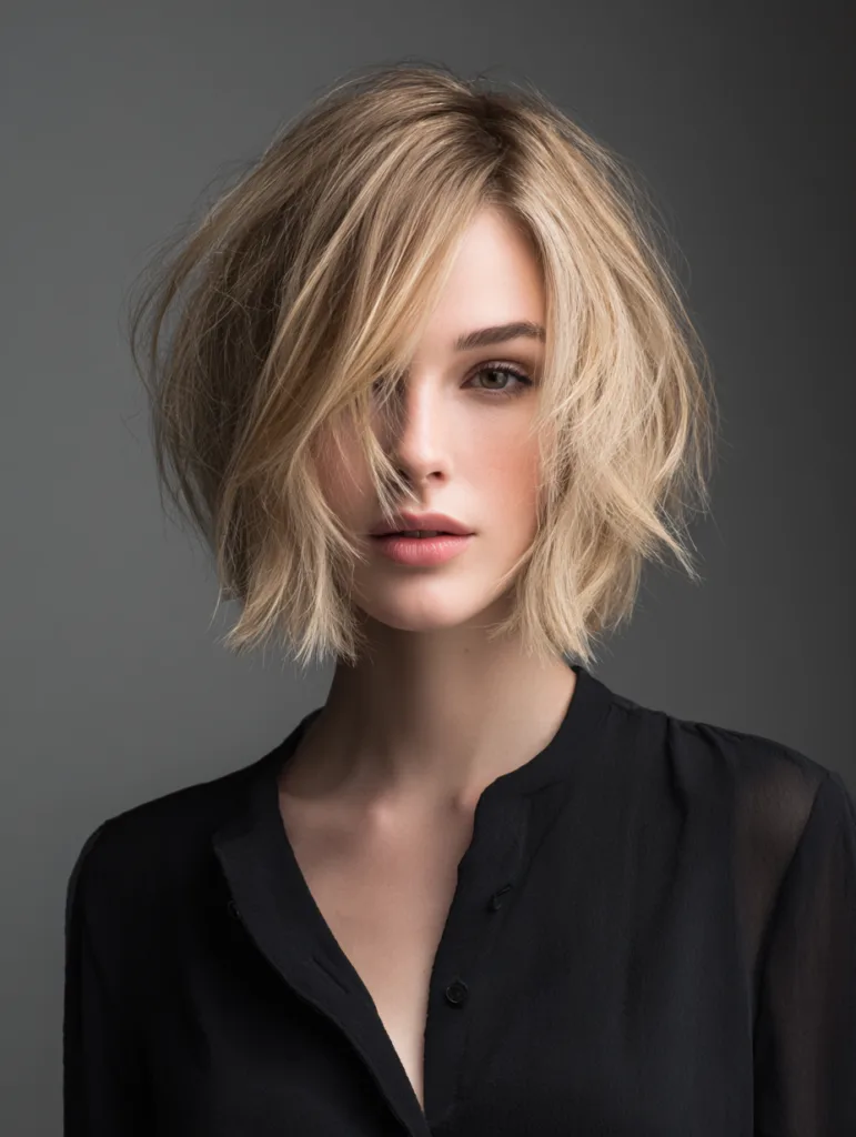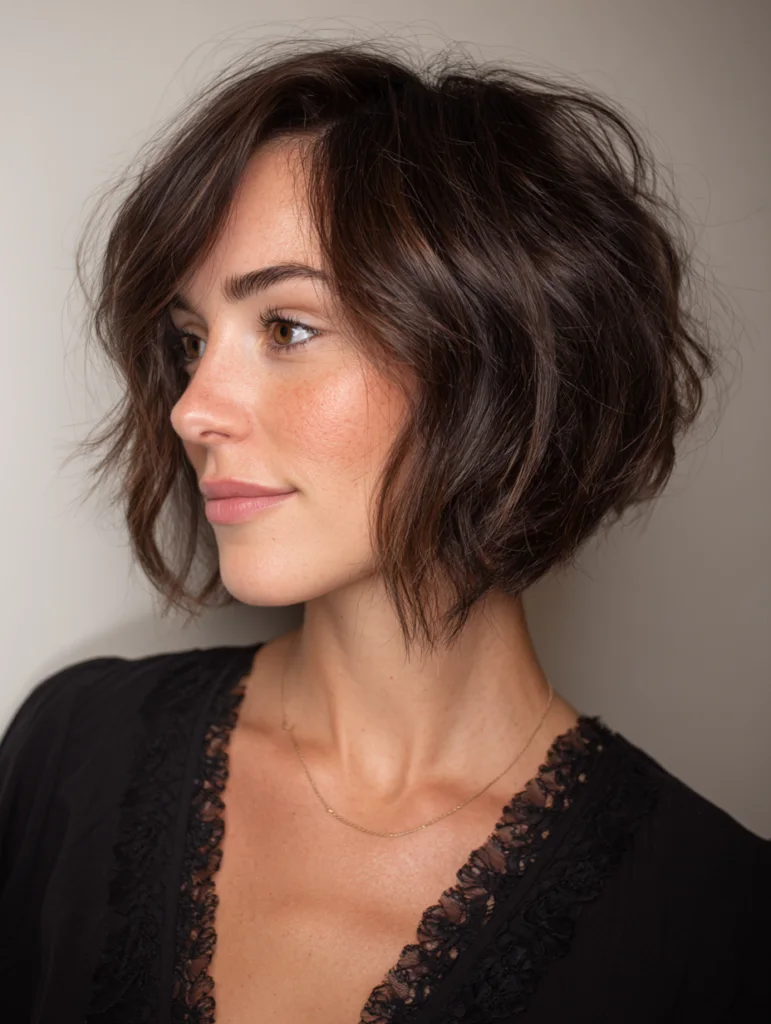 Side-swept pieces shift attention toward the front and give a choppy bob an elegant, directional flow. The longer front section blends into textured layers, creating movement without overwhelming the shape. Sweeping the hair across one side softens the profile and adds a gentle curve.