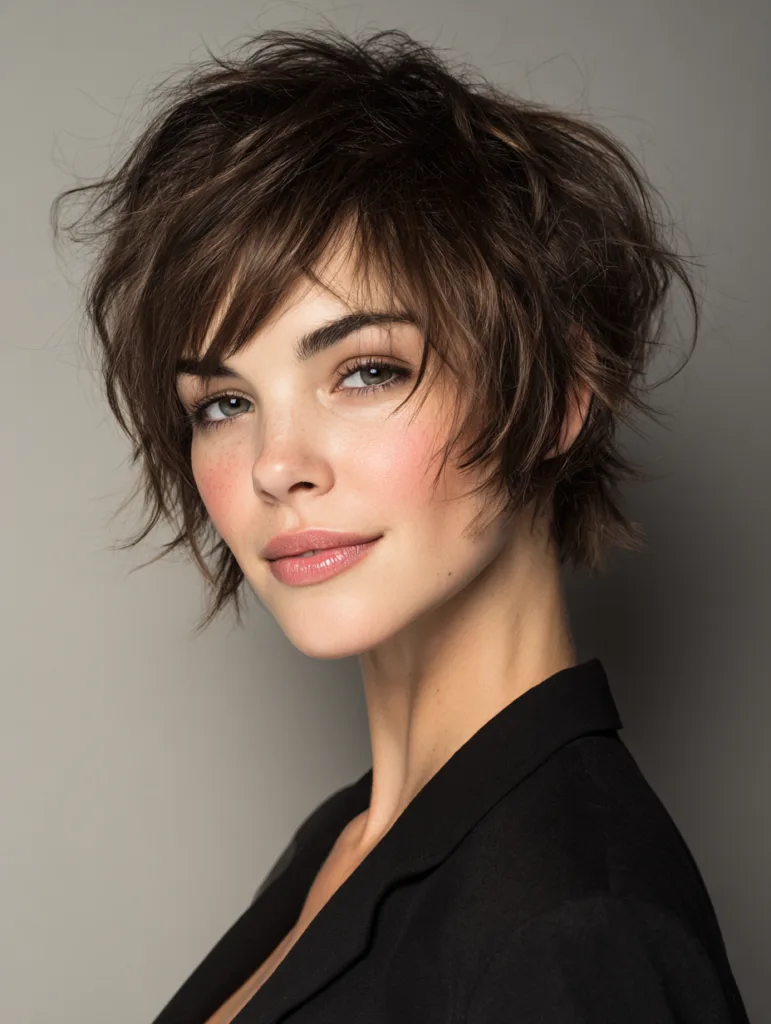 A short textured choppy bob offers strong definition while staying lightweight and manageable. Various lengths within the layers create controlled separation, preventing the cut from appearing uniform. The shorter sides lift easily and help frame the face with gentle movement.