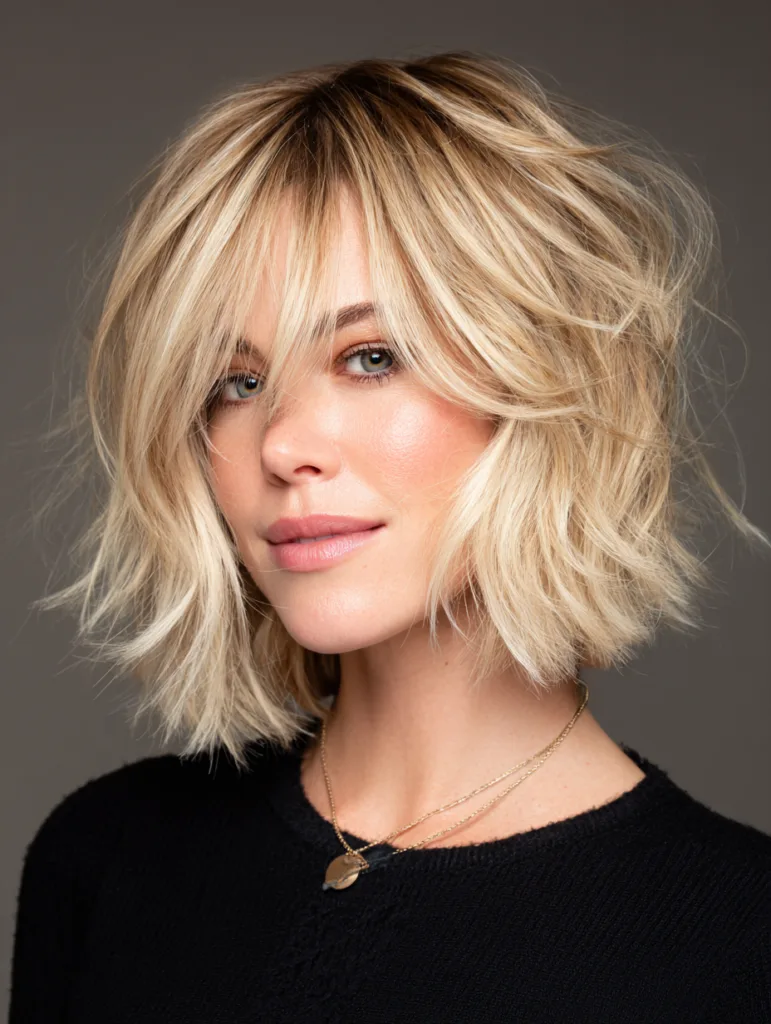 A shag-inspired choppy bob combines bob structure with shag-like energy, delivering a relaxed shape that moves freely. Layers vary in length, creating gentle separation from crown to ends. The cut often includes subtle face-framing pieces that soften the front without crowding it.