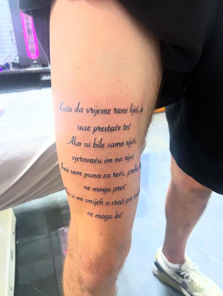 This tattoo features a beautifully written Croatian verse flowing gracefully along the thigh. The elegant cursive script captures emotion through its simplicity and rhythm. The text reflects deep sentiment about time, healing, and loss — a poetic reminder that some wounds linger despite time’s promise to mend.