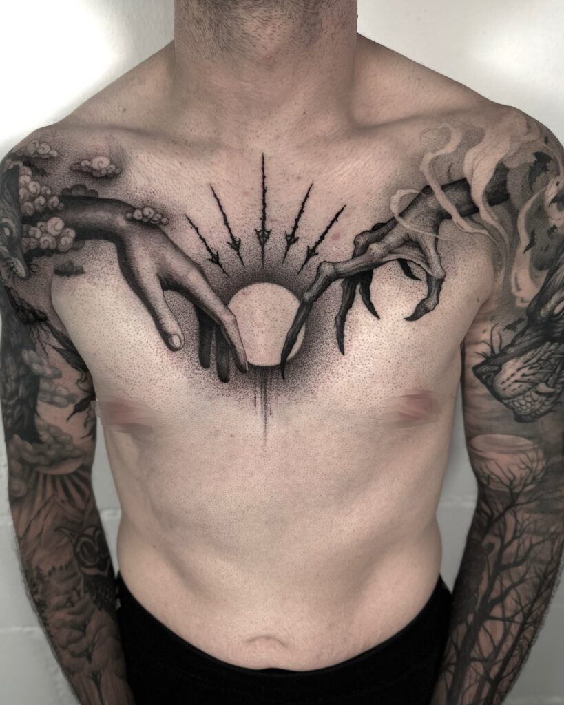 This powerful chest tattoo features two contrasting hands meeting above a glowing sun. One hand appears human, calm and detailed, while the other is skeletal and shrouded in smoke. The rays above the sun radiate upward like sharp beams of energy, creating a sense of divine tension.