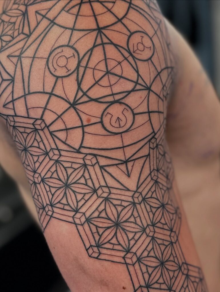 This tattoo showcases an intricate sacred geometry design flowing from the shoulder down the upper arm. It features interlocking circles, hexagons, and triangles, forming patterns that resemble the Flower of Life. Within the design, alchemical and planetary symbols add layers of mysticism and meaning.