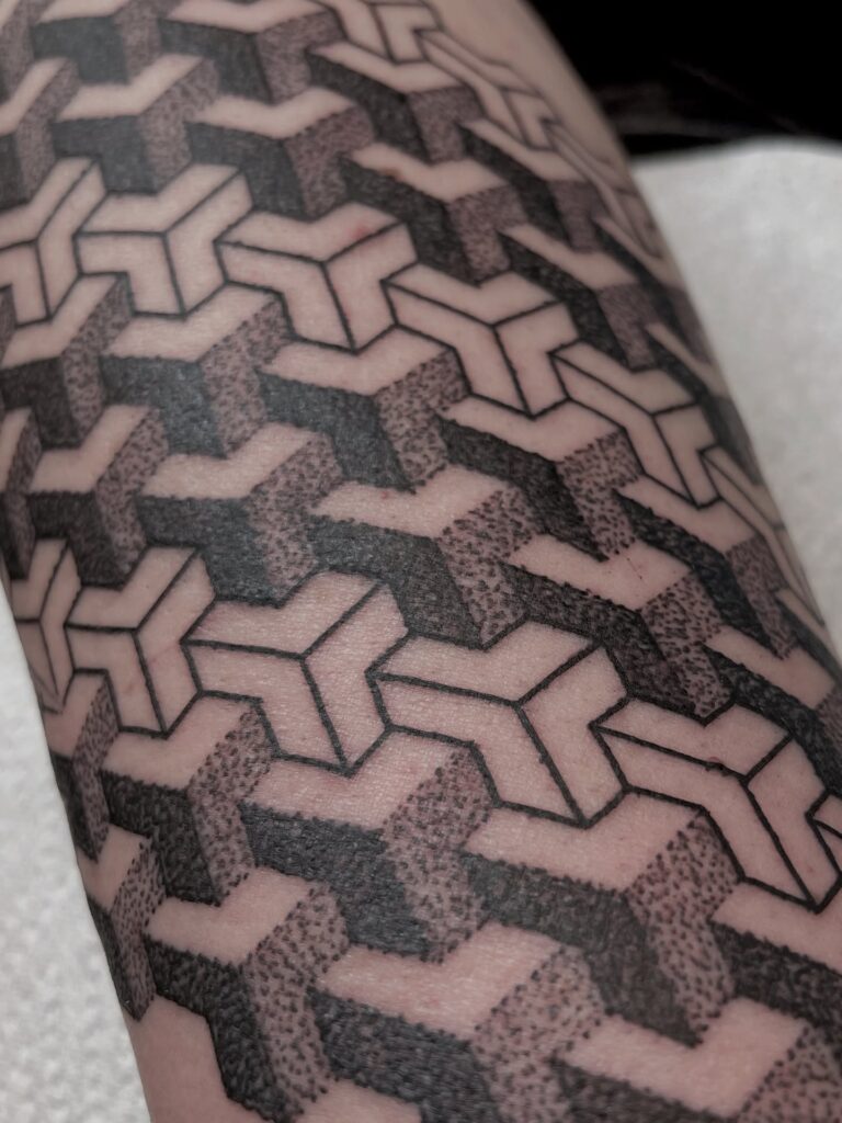 This tattoo features an intricate geometric pattern made up of interlocking three-dimensional shapes. Each block is defined by precise linework and shaded with fine dotwork, creating an optical illusion of depth and movement.