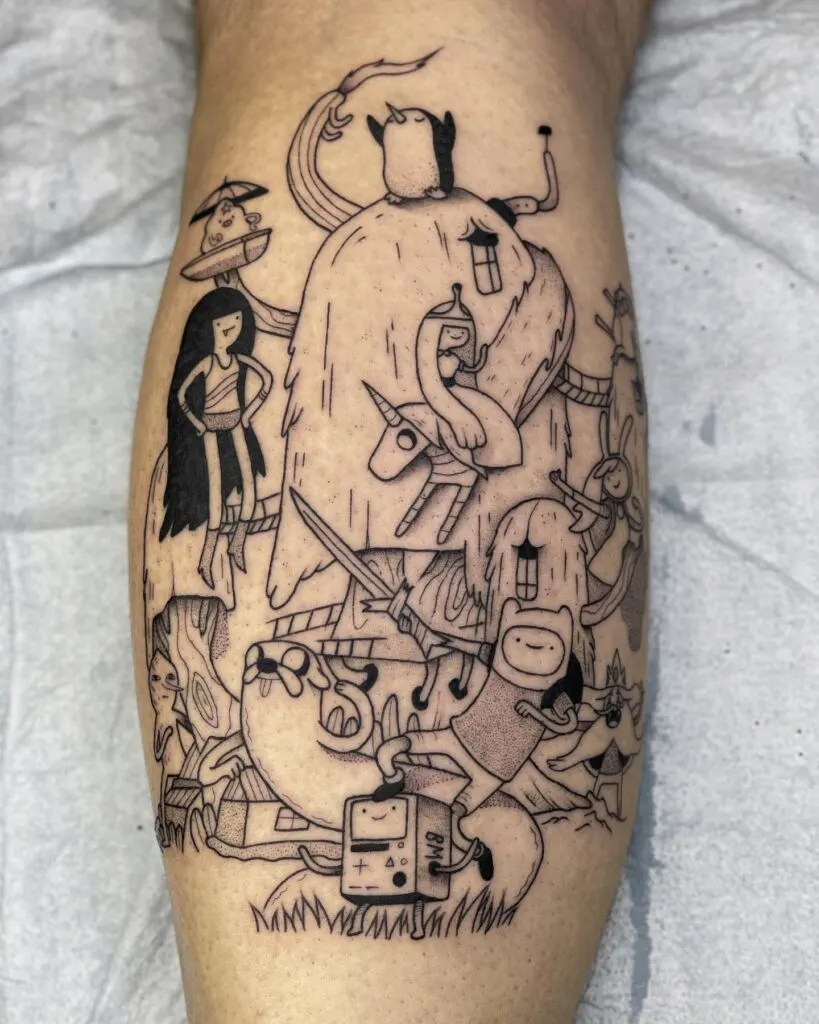 Marceline stands confidently nearby while BMO and other beloved characters fill the scene with energy. The artist used fine linework and subtle dot shading to capture the show’s charm without color. This tattoo perfectly blends nostalgia, friendship, and whimsy, honoring one of animation’s most imaginative universes.