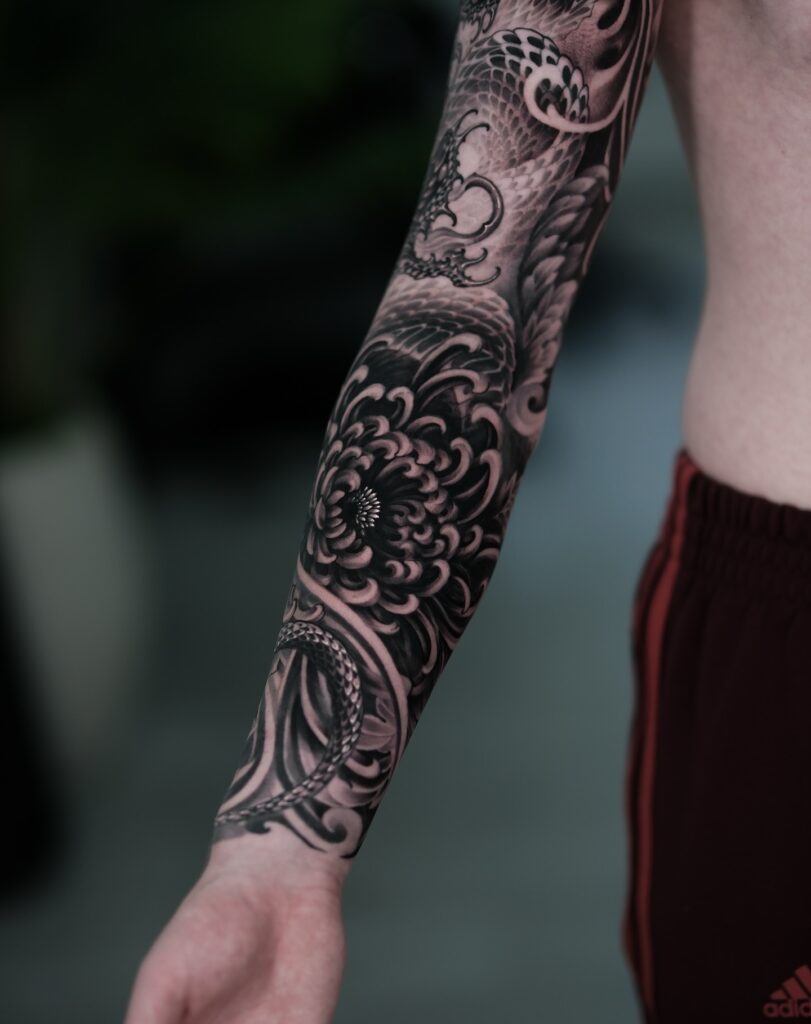 This striking sleeve tattoo features a Japanese-inspired dragon winding through bold black and grey shading. Its intricate scales flow seamlessly across the arm, blending with swirling clouds and a chrysanthemum that symbolizes strength and renewal.