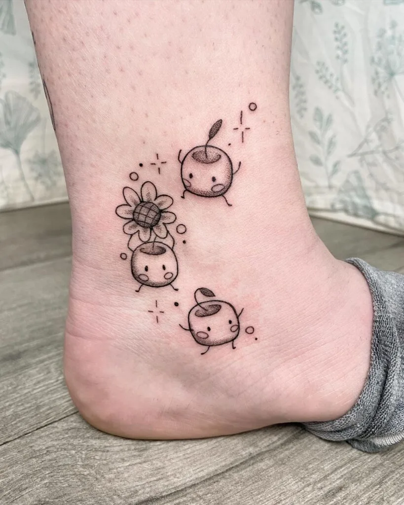 This adorable ankle tattoo features three tiny fruit-inspired characters with expressive faces and playful poses. Each one has a unique twist — a sprouting leaf, a blooming flower, and a simple stem. The artist used fine lines and light shading to keep the design soft and charming.