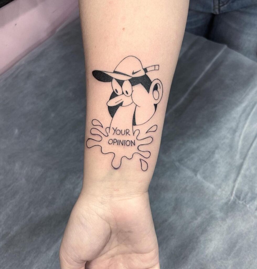 This bold and humorous tattoo features a cartoon-style face spitting out the words “Your Opinion.” The exaggerated eyes and simple hat design add to the character’s playful expression. The splash effect beneath the text gives the piece a dynamic, animated feel.