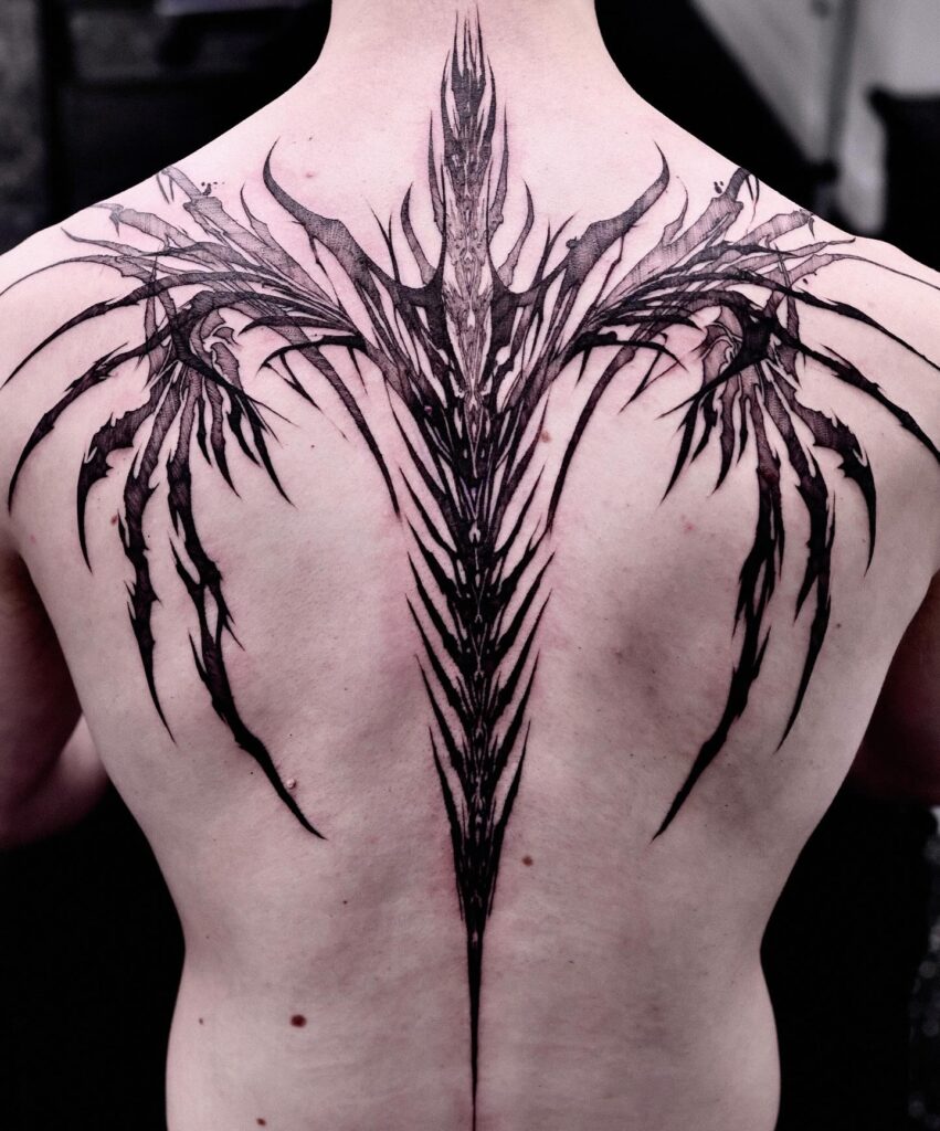 This bold back tattoo features a dramatic blackwork design resembling jagged wings emerging from a central spine. Sharp, organic lines extend across the shoulders, giving the impression of motion and power.