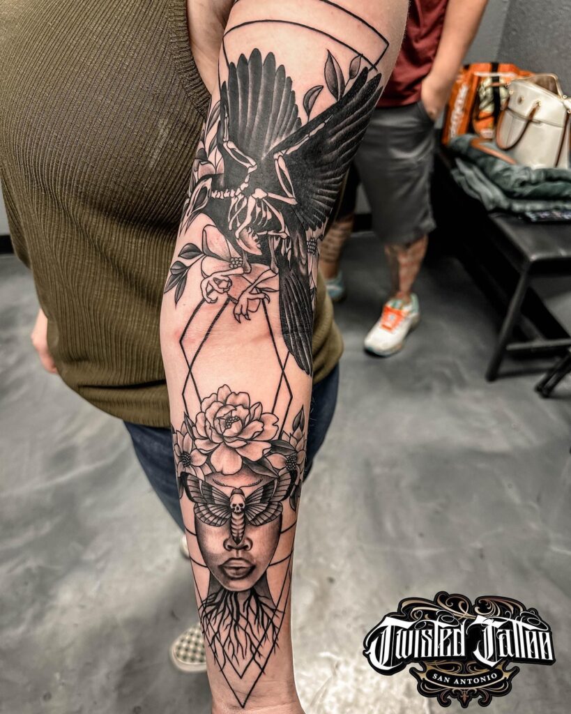 This detailed blackwork sleeve tattoo combines strength and symbolism through layered imagery. A woman’s face emerges from geometric lines, her hair transforming into roots that ground the design. Above her, a death’s-head moth rests beneath blooming flowers, symbolizing transformation and rebirth.