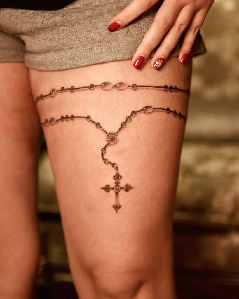 Rosary Thigh Tattoo with Hanging Cross